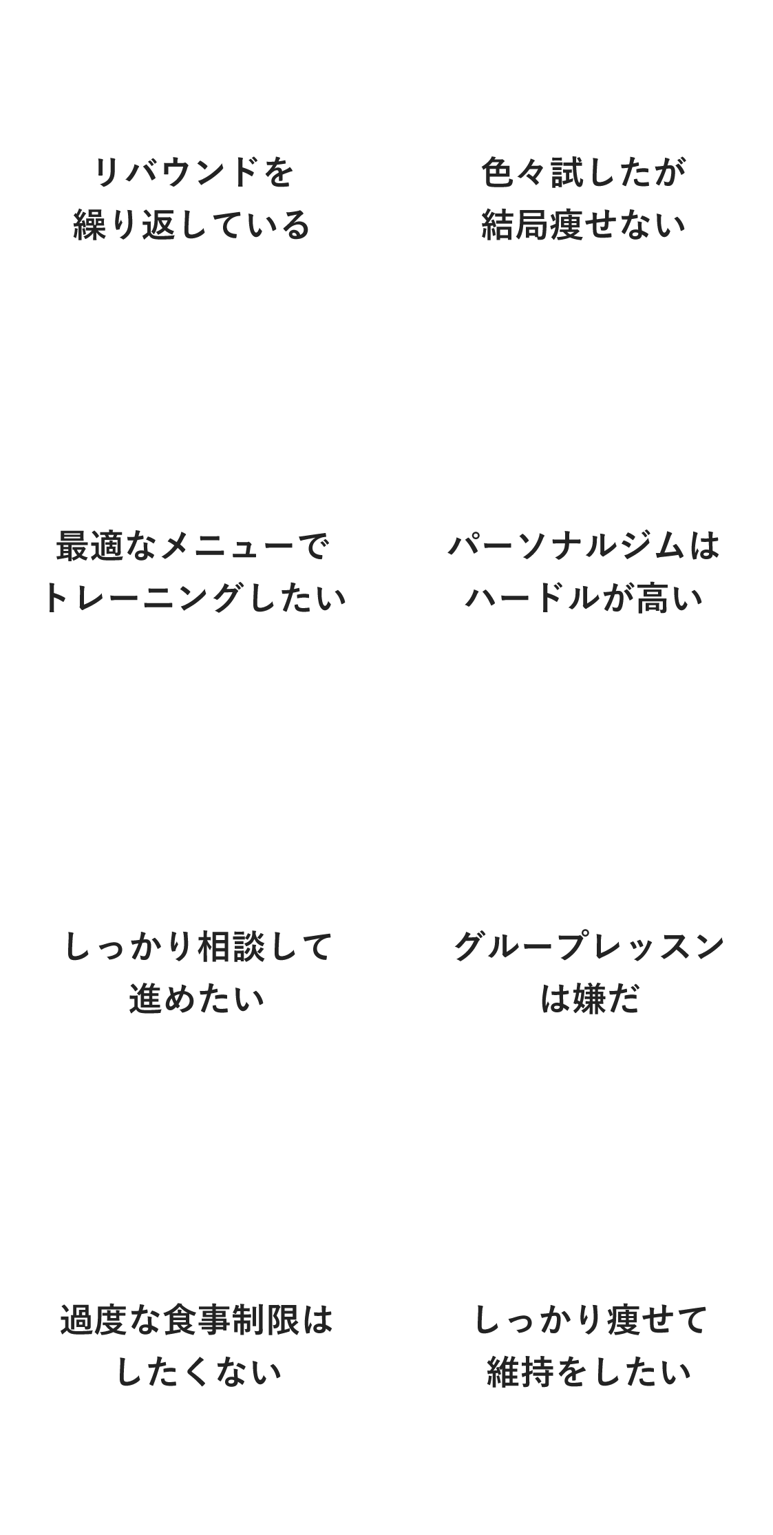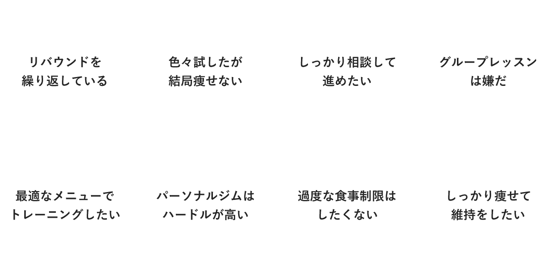 そんなご要望に応えるため、RIGORATHでは「しっかり痩せて、しっかりと維持する」という考えを大切に、長期的にダイエットの悩みから解放されるような無理のない・あなたのペースに合ったトレーニングメニューをご提案していきます。