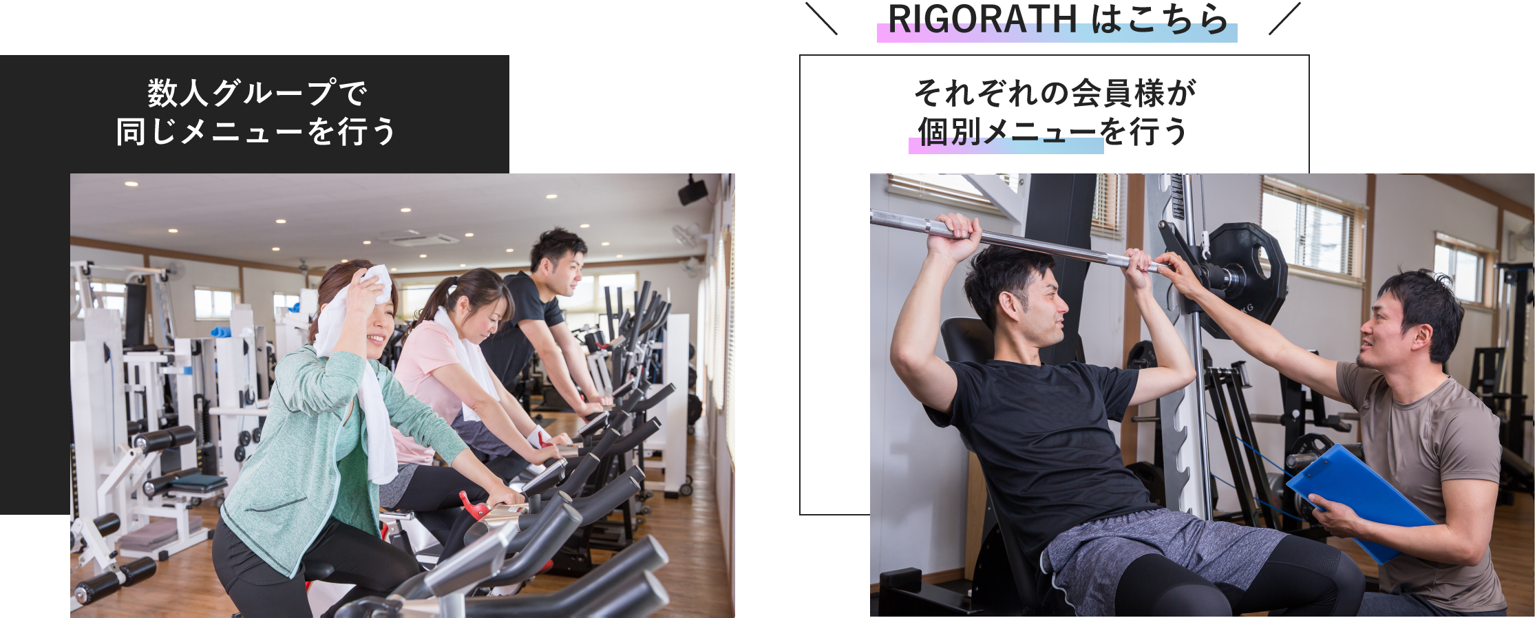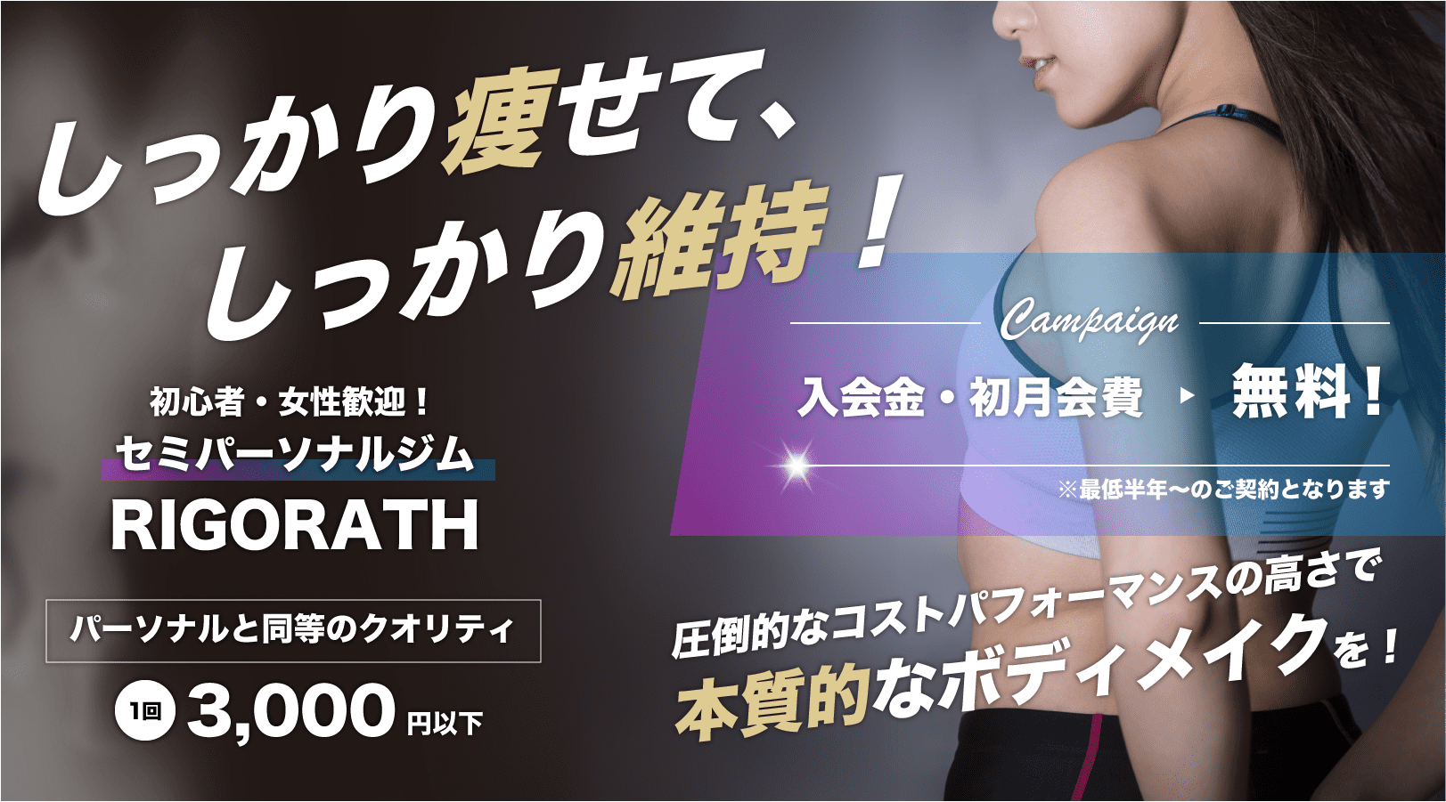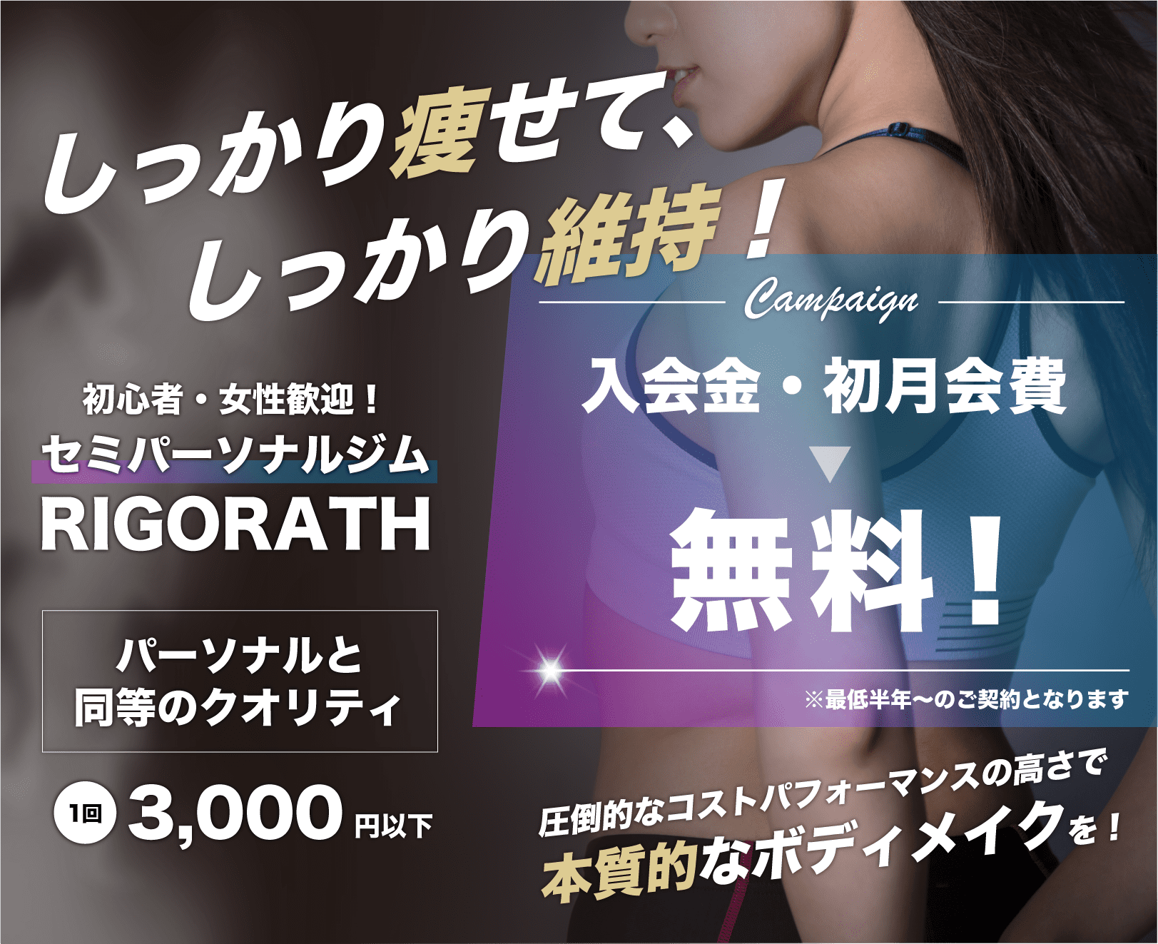 通常のジムだと正しいトレーニングができないしモチベーションも上がらない、かと言ってパーソナルジムに通うのハードルが高い、という方のために、セミパーソナルジムRIGORATHがあります。